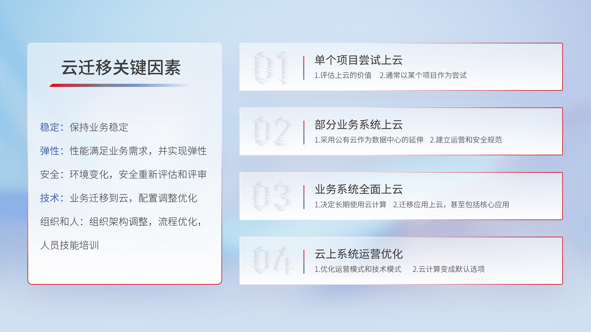 结合实际业务,,,从规划设计、、、、云平台选型、、、、云原生改造、、、、数据迁移、、、、集成交付,,,迁移全过程为客户识别最佳上云路径,,,,做好风险识别管理,,,设计网络架构、、、、身份权限、、、安全审计合规、、、操作审计、、、日志审计、、、、监控告警策略、、、多站点容灾设计等,,,,对云上基础设施进行整体规划,,,提升IT治理水平,,,以满足弹性、、、、高可用、、、高性能的需求。。